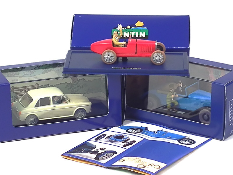 série 'EN VOITURE TINTIN' - comprend : la décapotable du LOTUS BLEU, la MG de l'Ile noire & le bolide de Bobby Smiles de TINTIN en Amérique - avec certificats