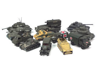 miniatures reproduisant notamment les modèles : HK HANOMAG, DODGE, BUSSING, RENAULT, BTR, AMX & CADILLAC - quelques carrosseries encrassées & modèles retouchés - avec manques