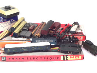 états de 'A' à 'R' - comprend notamment : 2 coffrets 'TRAIN ELECTRIQUE VE' (états 'A.b', incomplets), wagons de marchandises, fourgons à bagages, tenders dont 2 éléctriques (non testés) & 2 transformateurs - quelques parties non d'origine - on y joint 2 voitures de voyargeurs de la CIWL en tôle (avec traces d'oxydation)