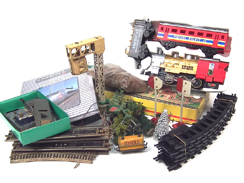 états de 'A' à 'E' - comprend notamment : éléments de décoration (différents arbres), contacteurs, rails, poteaux de signalisation & caténaires - on y retrouve notamment les marques : JEP & VB - on y joint un coffret 'TRAIN UNION EXPRESS' (jouet réalisé en plastique, état 'A.c') & un livre 'LA PASSION DES TRAINS' des éditions ATLAS (sous blister jamais ouvert)