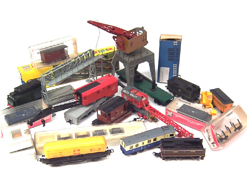 états de 'A' à 'R' - comprend notamment : wagons de marchandises, voitures de voyageurs, tenders dont un électrique (non testé), passerelle & grue portuaire (parties cassées) - on y retrouve notamment les marques : JOUEF (voie étroite), PIKO, ROCCO (minitrains) , LIMA, TRI-ANG & TRIX - 11 modèles avec boîtes dont 4 regroupés dans un coffret