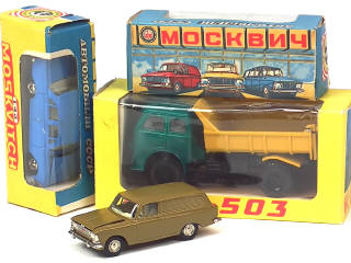 comprend : MOSVITCH (2 exemplaires différents, traces d'humidité) & MAZ camion benne carrière (châssis légèrement déformé)