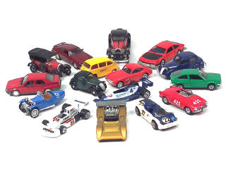 miniatures reproduisant notamment les modèles : FIAT, CISITALIA, HOWMET (état 'R'), ALFA ROMEO, LOLA & JAGUAR - on y retrouve notamment les marques : GUIOCHER, POLITOYS (un exemplaire avec importantes traces de métal fatigue), DUGU & MEBETOYS - petits manques