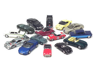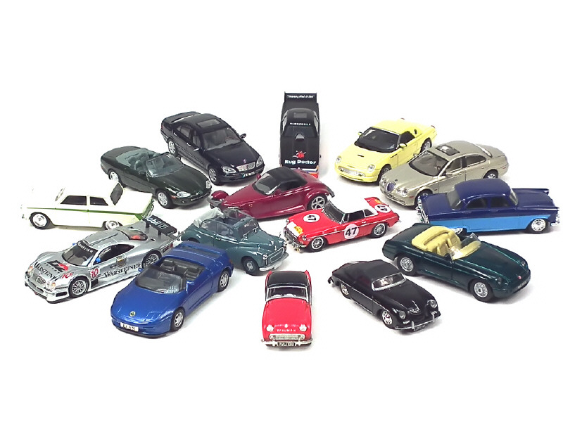 miniatures reproduisant notamment les modèles : FORD, MERCEDES, JAGUAR, PLYMOUTH, LOTUS & TRIUMPH - on y retrouve notamment les marques : CORGI TOYS, MAISTO & UNIVERSAL HOBBIES - quelques éléments cassés à recoller - petits manques