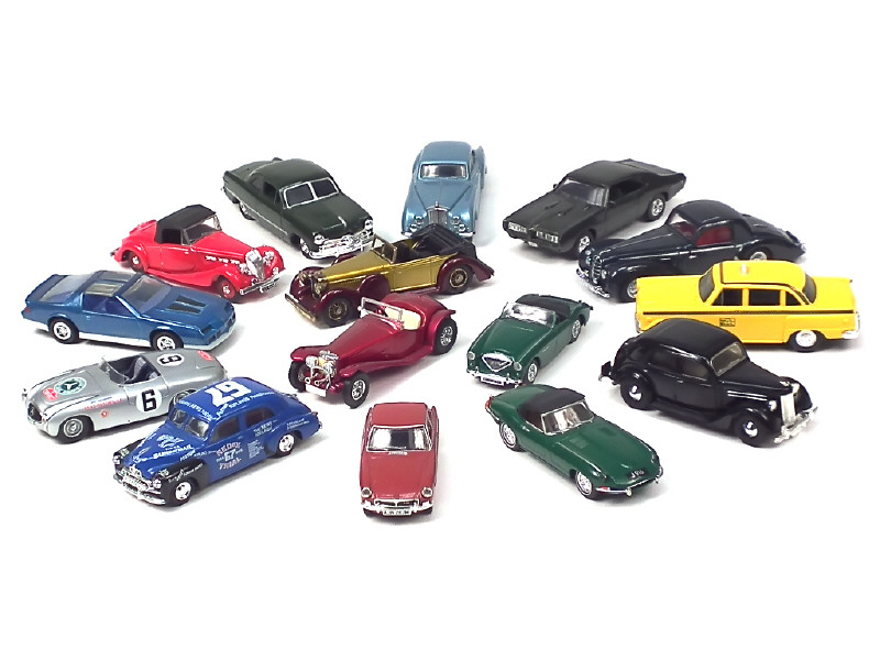 miniatures reproduisant notamment les modèles : DELAHAYE, PONTIAC, BENTLEY, AUSTIN, JAGUAR & MG - on y retrouve notamment les marques : DINKY MATCHBOX, ERTL, MATCHBOX & TRAX - une capote en état 'C' - quelques éléments cassés à recoller - petits manques