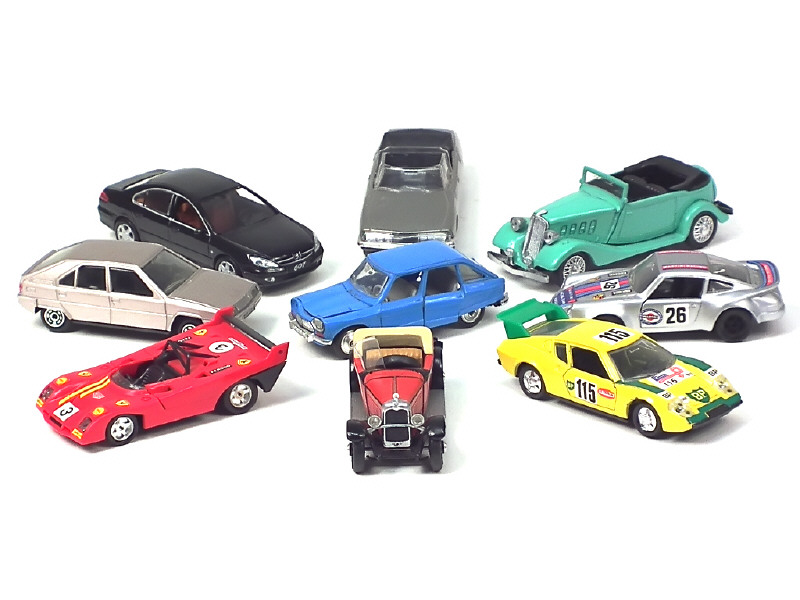 comprend : CITROEN SM PRESIDENTIELLE, BX, AMI 8, FERRARI, PORSCHE CARRERA, LIGIER JSII & PEUGEOT 607 - on y joint une CITROEN C4 (pare-brise à refixer) & une HOTCHKISS de la marque DUBRAY - petits manques