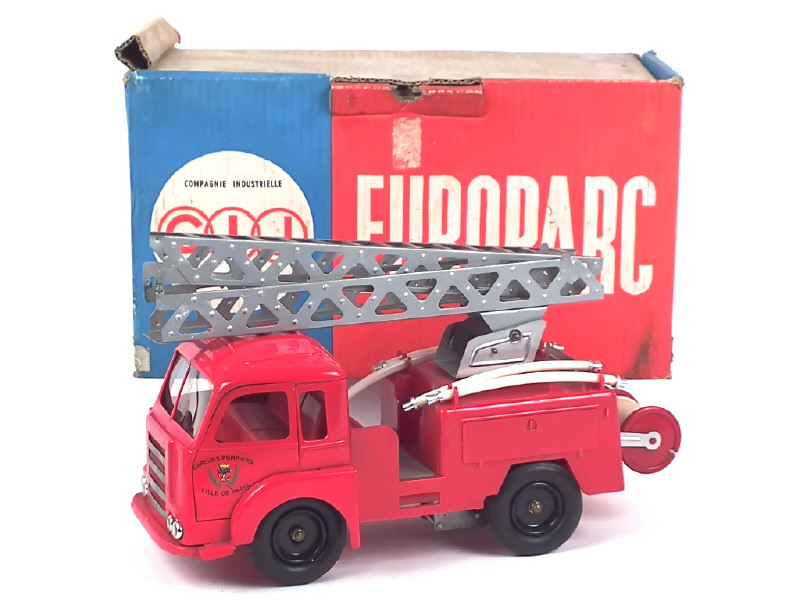 longueur 30 cm - moteur à clef (fonctionne) - avec direction, dévidoir (manque une petite partie) & 4 tuyaux amovibles - un petit enfoncement d'origine sur le toit de cabine - boîte plus ou moins tachée par endroits (principalement sur le rabat) - SUPERBE !