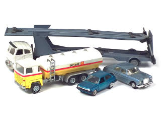 comprend : PEGASO camion porte-autos, SCANIA 140 citerne 'SHELL', MERCEDES 280S (sigle de calandre cassé à recoller) & FORD FIESTA - carrosseries des camions encrassées