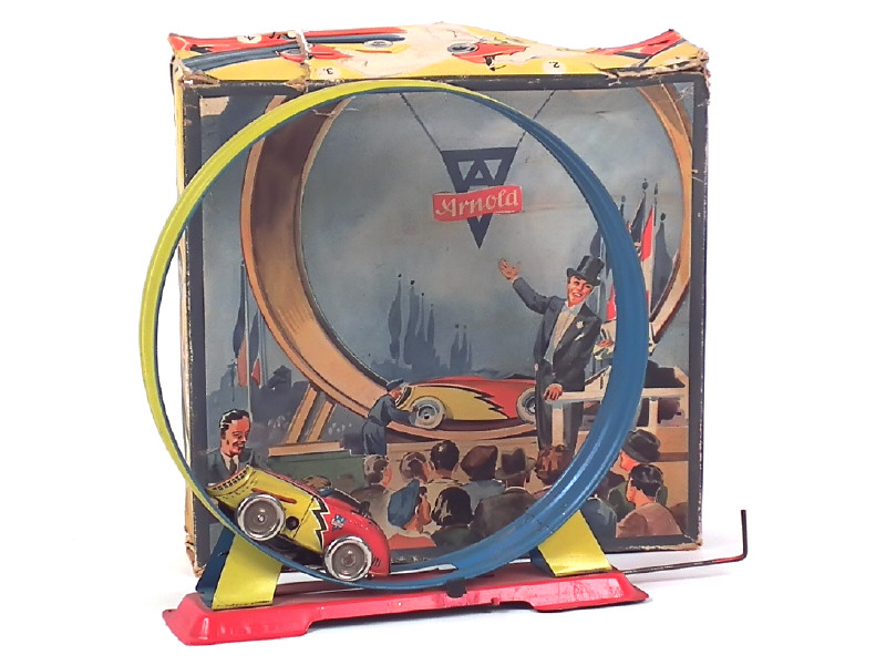 réalisation en tôle lithographiée - dimension 26 x 25 cm - contient : piste circulaire sur socle (système à ressort à revoir) & voiture de courses (moteur à clef fonctionne)