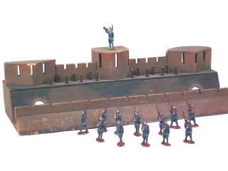 dimensions : 59 x 22,5 x 16 cm - un toit de bunker incomplet & un autre avec un petit manque - on y joint 13 soldats français au défilé dont un avec clairon de la marque QUIRALU (quelques éclats plus ou moins importants) - petite étiquette collée sur le socle 'JOUET FRANCAIS INCASSABLE QUIRALU' - très légères fêlures par endroits