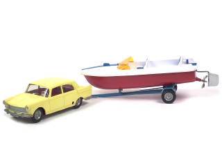 longueur 21 cm - moteur à clef (fonctionne) - on y joint le hors bord (manque volant, pare-brise déformé, une petite fêlure à l'arrière de la carrosserie, moteur non testé) sur remorque normalement associée au modèle téléguidé
