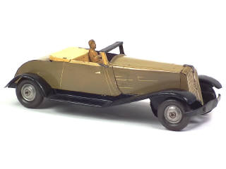longueur 33 cm - moteur à ressort (fonctionne) - avec direction - un montant de pare-brise cassé - avec conducteur - légères restaurations - traces d'oxydation plus ou moins importantes par endroits - quelques petits manques