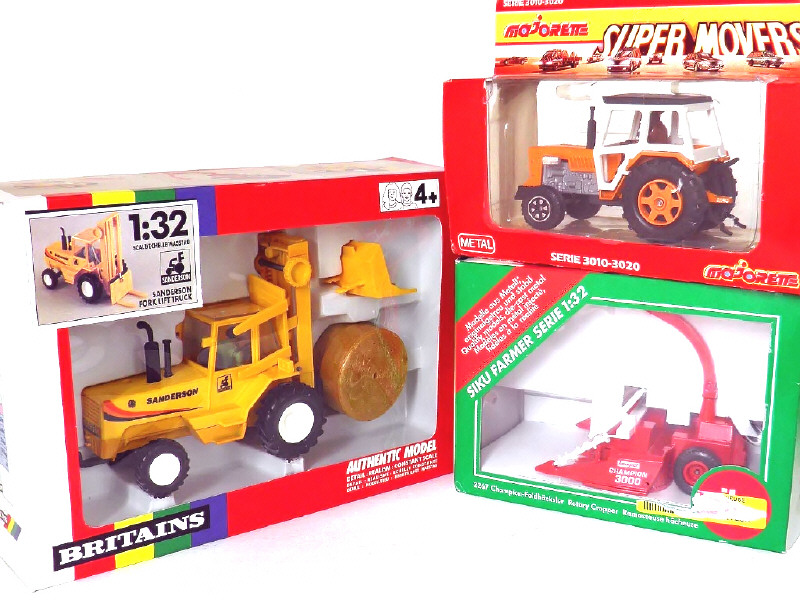comprend : un tracteur (un éclat sur une aile), KEMPER CHAMPION 3000 ramasseuse hacheuse & SANDERSON chariot élévateur (avec balle de foin) - on y retrouve les marques : MAJORETTE, SIKU & BRITAINS