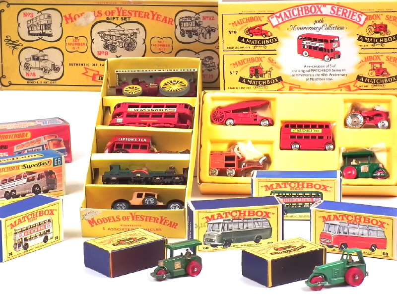comprend : rouleau-compresseur (3 exemplaires différents), autobus londoniens (3 exemplaires différents), tracteur agricole, voiture de pompiers, autocar (4 exemplaires différents dont un avec boîte en état 'c'), 2 véhicules hippomobiles, un à vapeur, une locomotive, une MORRIS & un tramway - 10 modèles regroupés dans 2 coffrets dont un en état 'c'