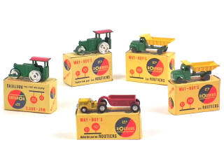 comprend : rouleau à vapeur (2 exemplaires identiques dont un avec une boîte en état 'c'), camions-bennes carrières (2 exemplaires identiques) & benne lourde (état 'C.b', avec éclats majeurs & inscriptions sur le fond de benne)