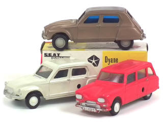 longueur 14,5 cm - moteurs fonctionnent (manque une clef) - comprend les modèles : AMI 6 & DYANE - un véhicule en boîte (état 'b')