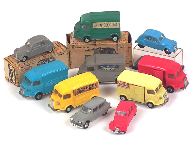 série MICROMINIATURES - états de 'A' à 'C' - comprend les modèles : 1200 kg (6 exemplaires différents dont 3 publicitaires), 2 CV (3 exemplaires différents dont un avec un rivet incomplet) & AMI 6 - carrosseries légèrement déformées - 3 modèles en boîte (états 'b' & 'd')