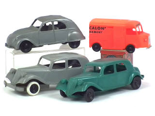 différentes échelles - comprend les modèles : TRACTION 11CV (2 exemplaires différents avec moteurs à friction fonctionnent dont un en état 'C' avec parties cassées & manquantes), 2CV (moteur à friction fonctionne) & 1200 KG (publicités ajoutées)