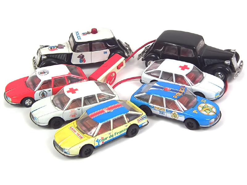 différentes échelles - comprend notamment : 'POLICE', 'TOUR DE FRANCE' & 'HOSPITAL GENERAL' - 4 exemplaires avec moteurs à friction (2 fonctionnels) & 3 autres avec moteurs à piles (à revoir) - un plancher légèrement fondu - quelques carrosseries légèrement décolorées