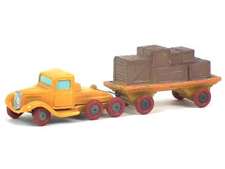 longueur de l'ensemble 18 cm - réalisation en plâtre & farine avec châssis en tôle - avec direction & chargement de caisses - la remorque est en état 'D' avec retouches - pneus non d'origine