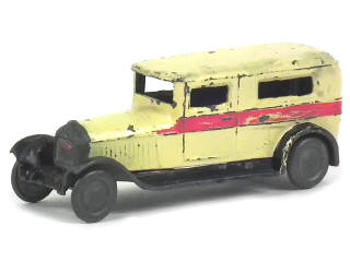 modèle en plomb de 1930 - manque fanion - retouches plus ou moins importantes - fixation avant de plancher cassée - traces d'humidité sur la carrosserie