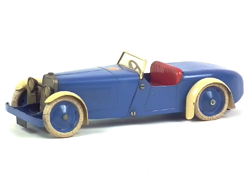 réalisation en tôle - longueur 23,5 cm - moteur à clef (fonctionne) - avec clef, direction & frein - caoutchouc des pneus séché & craquelé - quelques petits éclats sur le pare-brise