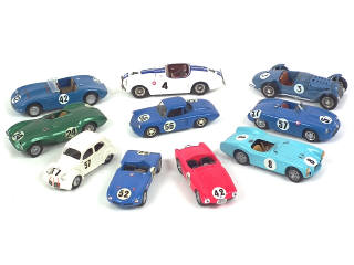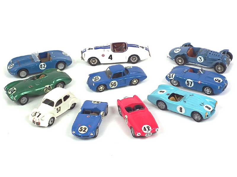 miniatures reproduisant notamment les modèles : CUNNINGHAM, TALBOT, PANHARD (dont une CIJ en état 'R', avec parties non d'origine), DELAHAYE & DB - on y retrouve notamment les marques : PROVENCE MOULAGE, EXEM & HECO-MODELS - 9 kits montés - possibilité de petits manques