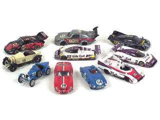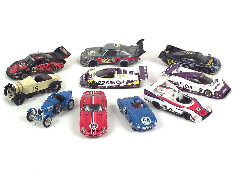 miniatures reproduisant notamment les modèles : PORSCHE (un élément à refixer sur un exemplaire), JAGUAR, RONDEAU, FERRARI, PANHARD & BUGATTI - on y retrouve notamment les marques : MRE, PROVENCE MOULAGE, CCCF, AMR & ELIGOR - 9 kits montés - possibilité de petits manques