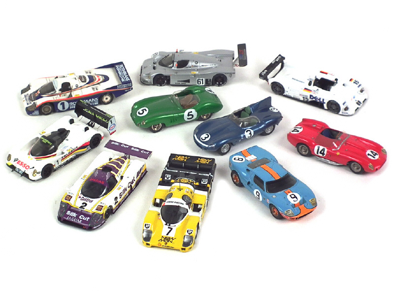 9 kits montés - miniatures reproduisant notamment les modèles : SAUBER MERCEDES, FERRARI, FORD, ASTON MARTIN, PORSCHE, JAGUAR & PEUGEOT - on y retrouve notamment les marques : STARTER, RECORD, PROVENCE MOULAGE & MINICHAMPS - possibilité de petits manques