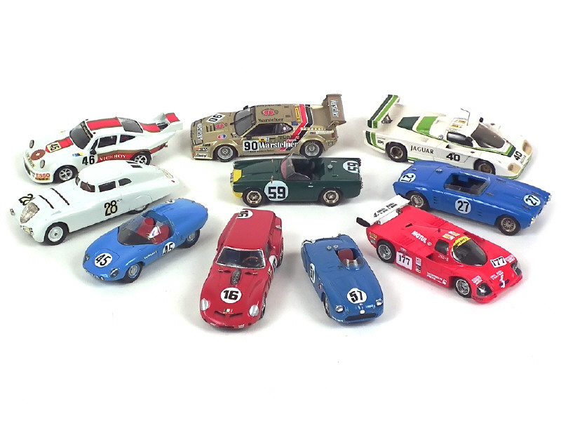 9 kits montés - miniatures reproduisant notamment les modèles : PORSCHE, FERRARI, BMW, ADLER, JAGUAR, PANHARD & TRIUMPH - on y retrouve notamment les marques : MRE, GRAND PRIX MODELS, MINICHAMPS, MIKANSUE, AMX, JPS, PROVENCE MOULAGE & PARADCAR - possibilité de petits manques