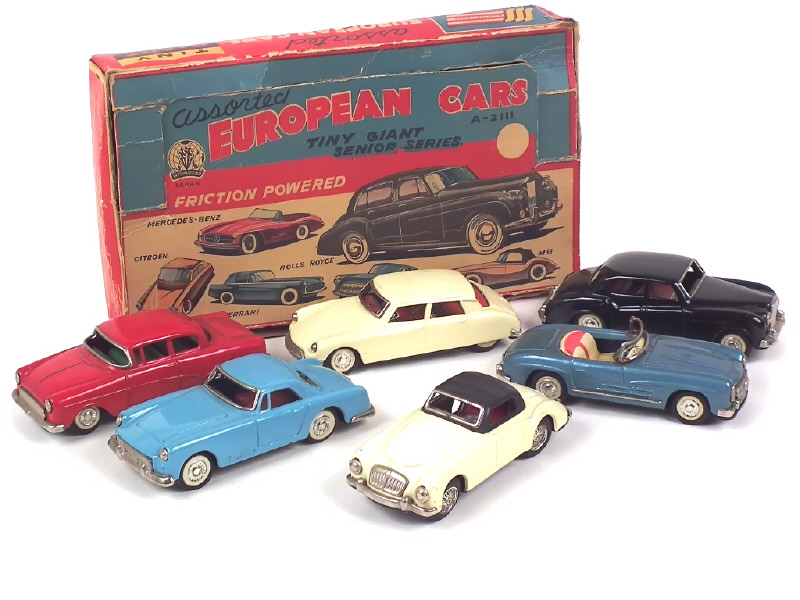 série 'TINY GIANT' - longueur de chaque véhicule : 14 cm - moteurs à friction (fonctionnent) - contient : OPEL (moteur à revoir) , ROLLS ROYCE, FERRARI (un défaut d'usine sur le côté droit de la carrosserie), MG, MERCEDES (moteur à revoir, entourage de pare-brise oxydé, cassé & recollé) & CITROEN DS (très légers enfoncements sur le toit)
