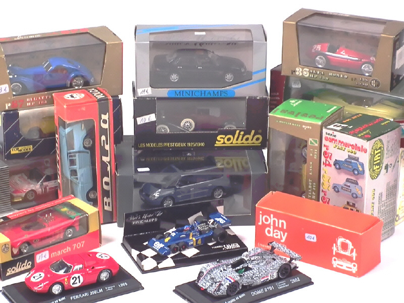 différentes échelles - on y retrouve notamment les marques : SOLIDO, VITESSE, JOHN DAY, BRUMM, MINICHAMPS, CORGI TOYS, MATCHBOX & SCHUCO - possibilité de petits manques - quelques boîtes en état 'c'
