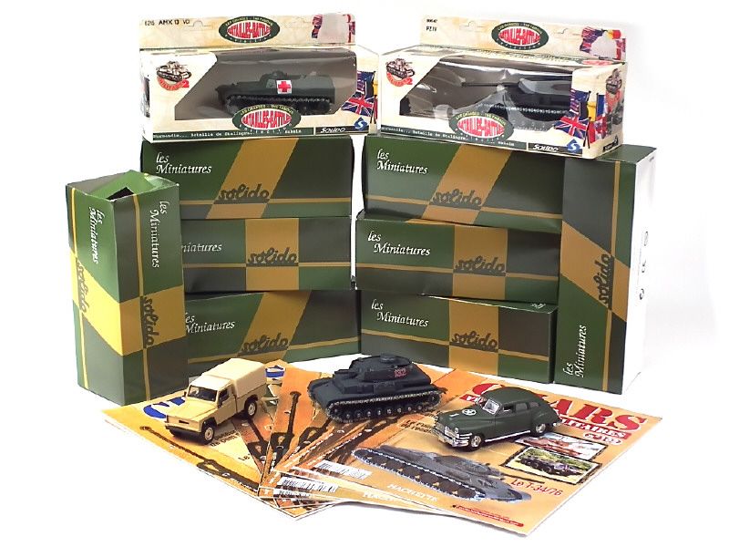 modèles vendus en kiosque - miniatures reproduisant notamment les modèles : PT76, T34, CHRYSLER, PANZER IV, LAND ROVER & GMC - on y joint un PANZER IV & un AMX 13 VCI de la marque SOLIDO & 20 fascicules de la collection - quelques petits manques -