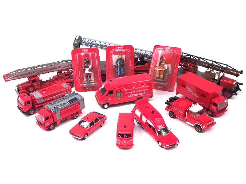 miniatures reproduisant notamment les modèles : IVECO, CITROEN, BERLIET, RENAULT, VOLKSWAGEN, ACMAT, EUROCOPTER (avec boîte & vendu en kiosque), MERCEDES & MAGIRUS - on y retrouve notamment les marques : OMO, SCHUCO, CORGI TOYS, SOLIDO, NOREV, STL & LBS - on y joint 4 figurines de pompiers sous blisters jamais ouverts de la marque DEL PRADO - quelques petits manques