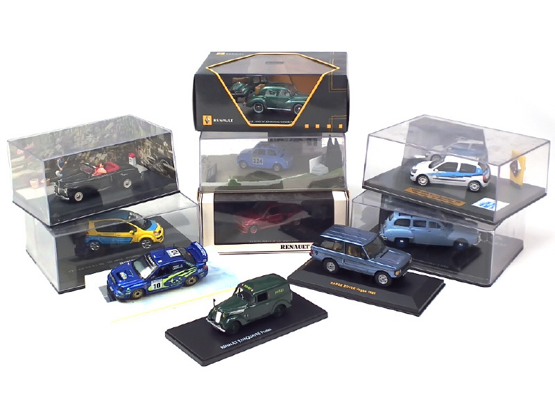 miniatures reproduisant les modèles : SUBARU, RENAULT, RANGE ROVER, FIAT & PEUGEOT - on y retrouve notamment les marques : UNIVERSAL HOBBIES, IXO, ELIGOR & ALTAYA