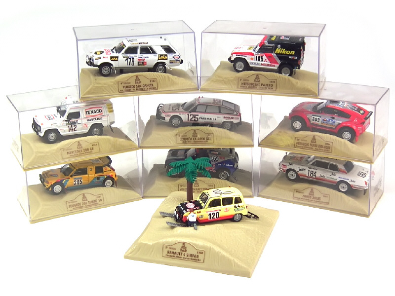 réalisés par NOREV - comprend : PEUGEOT 205 TURBO 16, 504 DANGEL, ROLLS ROYCE PROTO JULES, MERCEDES 280 GE, VOLKSWAGEN TOUAREG, MITSUBISHI PAJERO (2 exemplaires différents), CITROEN CX 2400 & RENAULT 4 SINPAR