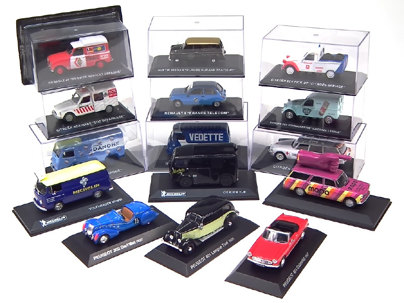 modèles vendus en kiosque - miniatures reproduisant les modèles : PEUGEOT, RENAULT, CITROEN, VOLKSWAGEN & AUSTIN - 6 exemplaires sans boîte - quelques petits accessoires cassés & d'autres manquants