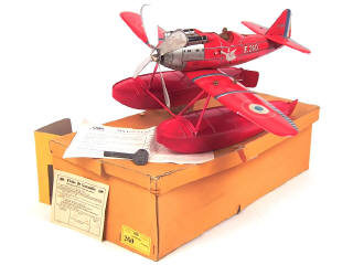 modèle réalisé en 1934 - envergure 48 cm - moteur à clef (fonctionne) - avec clef, cales de boîte, bon de garantie, notice de montage & de fonctionnement - très légers frottements par endroits - ETAT EXCEPTIONNEL POUR UN MODELE DE CETTE EPOQUE AVEC SA RARE BOITE D'ORIGINE !