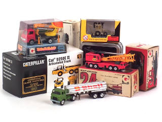comprend : CATERPILLAR D250 E II tombereau articulé, 420 E BHL bulldozer, ELF camion de forage, camion grue 'P&H', ISUZU semi-remorque citerne 'SHELL' & PRINOTH chasse-neige (chenilles cassées & incomplètes) - on y retrouve notamment les marques EDAI GRIP & NORSCOT - on y joint une montre 'CAT' en coffret (fonctionne) - une boîte en état 'c'