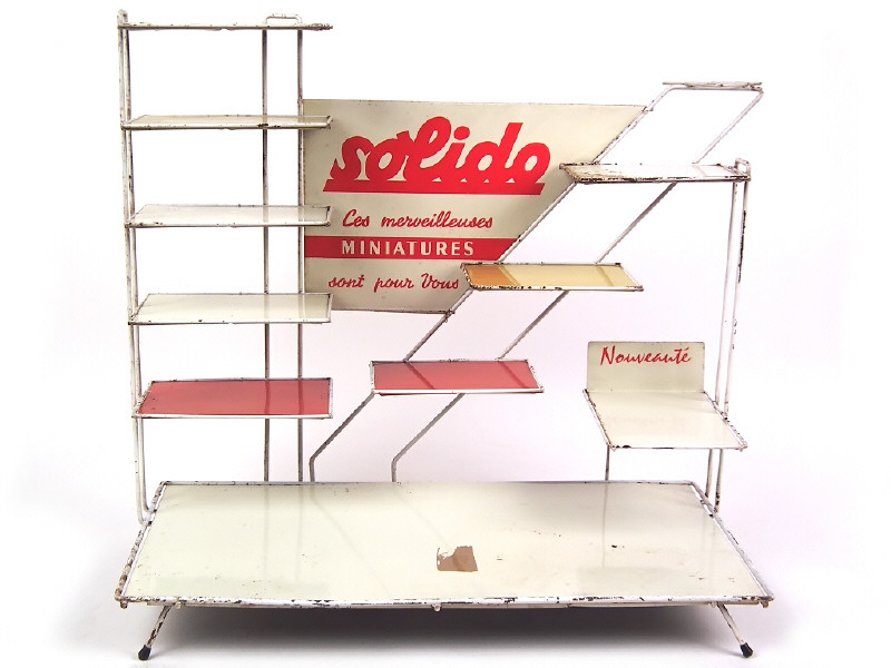 dimensions : 53 x 29 x 50 cm - traces d'oxydation plus ou moins importantes par endroits (notamment sur un support) - publicité ' SOLIDO CES MERVEILLEUSES MINIATURES SONT POUR VOUS' - avec un support permettant la présentation d'une nouveauté