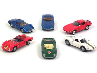 comprend : ALFA ROMEO 33 (manques sur les décalques - légères traces de colle sur le vitrage), GIULIA CANGURO, FERRARI DINO (suspensions avant affaissées), 330 (manque pilote), PORSCHE 904 GTS & LAMBORGHINI 350 GT- on y retrouve les marques : MERCURY & POLITOYS