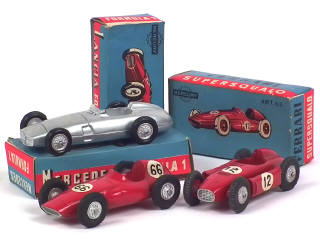 comprend : FERRARI SUPERSQUALO (boîte état 'b'), LANCIA F1 (boîte état 'd') & MERCEDES F1 (quelques petits éclats plus ou moins importants) - 2 modèles avec pneus non d'origine (séchés) & petits détails de peinture argentée ajoutés