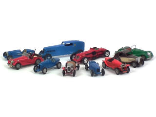 kits montés - miniatures reproduisant notamment les modèles : AMILCAR, RENAULT, MG, NAPIE & MORGAN - on y retrouve notamment les marques : AUTO REPLICAS, HOBBY TECNICA & ARDENA - quelques petits manques