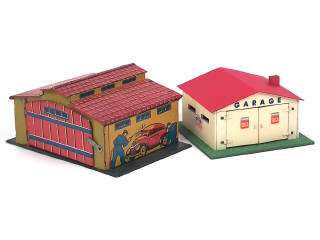 comprend : un exemplaire en tôle lithographiée (dimensions 24x17x10 cm - avec pont élévateur) & un autre en isorel & tôle (dimensions 17x17x9 cm) - on y retrouve les marques MEMO & DEPREUX