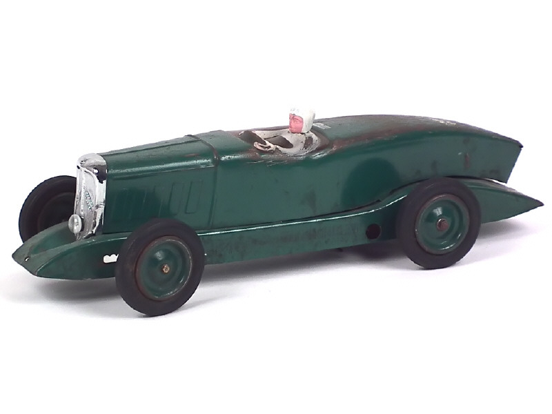longueur 43 cm - moteur à clef (à revoir) - quelques éléments non d'origine (notamment calandre, fixations & axe de roue avant) - traces d'oxydation sur la carrosserie, le moteur & l'axe de roues arrière - 2 perforations sur le châssis - tête du pilote repeinte - importants frottements sur le dessus de la carrosserie