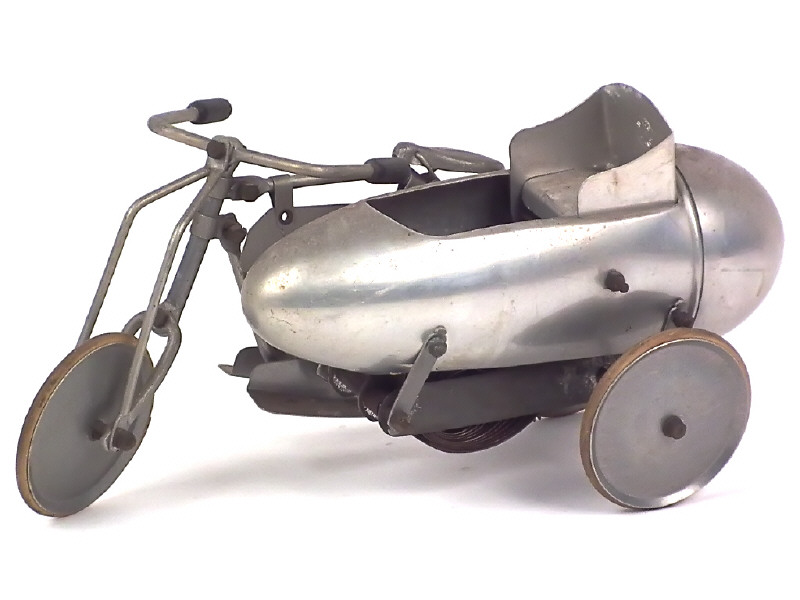 longueur 25 cm - moteur à clef (fonctionne) - pneus séchés - traces d'humidité & d'oxydation plus ou moins importantes par endroits (notamment sur le moteur) - léger enfoncement sur l'arrière du side-car avec une fixation manquante - poignée de guidon fendue