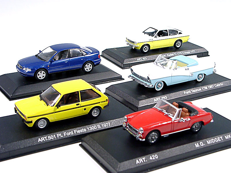 miniatures reproduisant les marques : AUDI, FORD, OPEL & MG - un des modeles est de la marque 'MINICHAMPS' - avec 5 suremballages en carton