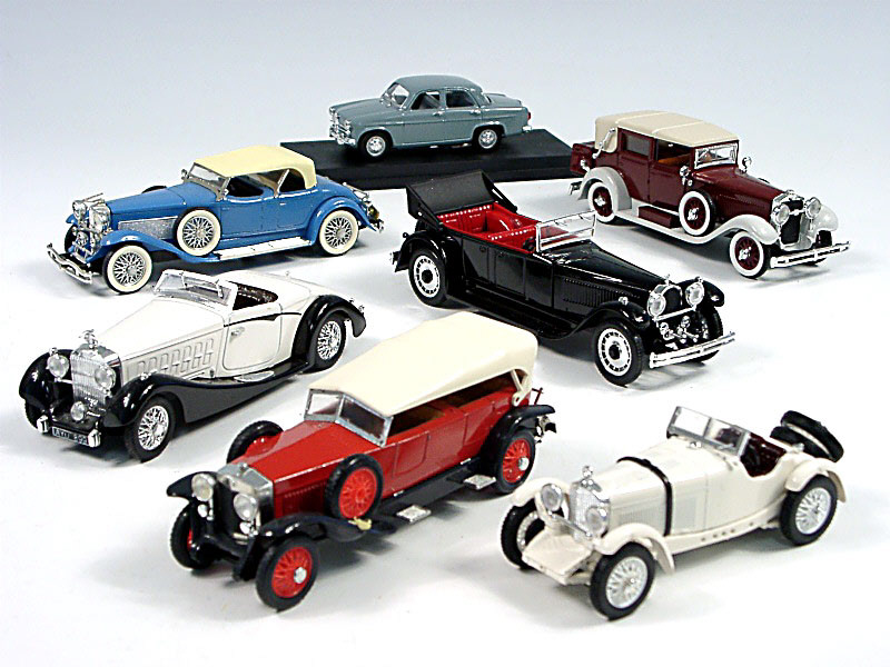 miniatures reproduisant les marques : FIAT, HISPANO SUZA, ALFA ROMEO, ISOTTA FRASCHINI, DUESENBERG & MERCEDES - un modèle avec boîte - manque une partie d'arbre à transmission sur l'un des modèles
