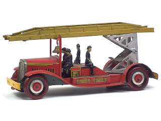 longueur 38 cm - avec moteur à ressort (fonctionne) & direction - quelques parties plus ou moins ternies (notamment la calandre et le support d'échelle) avec légères traces d'oxydation par endroits