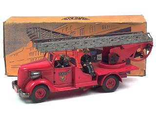 longueur 39 cm - avec moteur à clef (fonctionne), direction & 3 pompiers - légères traces d'oxydation sur le moteur & l'échelle (manques de peinture sur le support) - boîte légèrement déformée